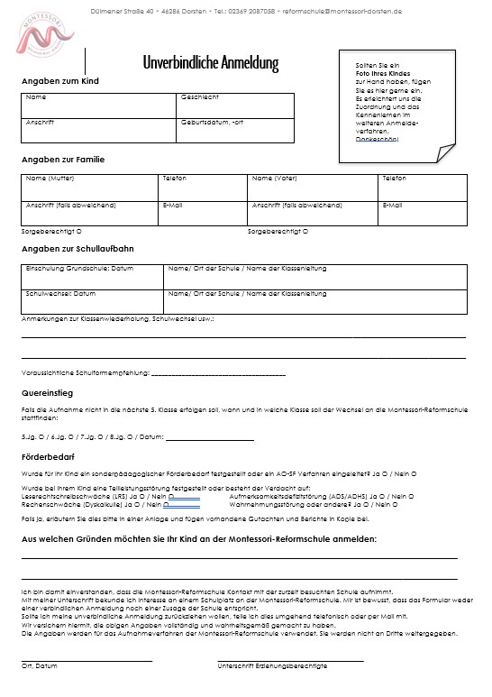 Liebe Eltern, wenn Sie Interesse daran haben, Ihr Kind an der Montessori-Reformschule (private Realschule) anzumelden, lassen Sie uns bitte zunächst eine unverbindliche Anmeldung zukommen.