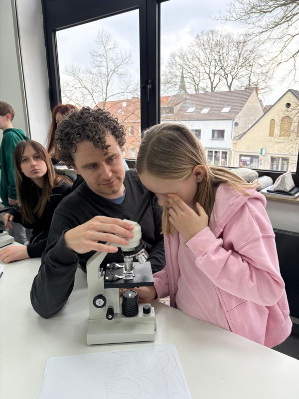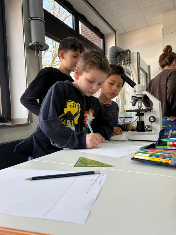 Die Schüler*innen des siebten Jahrgangs hatten interessante Stationen aus Erdkunde und Biologie vorbereitet und standen den Jüngeren unterstützend zur Seite. So konnten die Kinder neugierig forschen, mikroskopieren, entdecken und ausprobieren.
