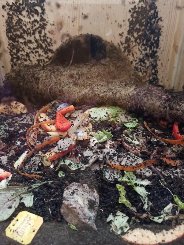 In akribischer Detailarbeit wurde eine großartige Holzkiste mit einer Beobachtungsscheibe aus Plexiglas, abnehmbarem Deckel, Lüftungslöchern und einer Auffangschale gebaut. Nachdem die bestellte Grundausstattung, bestehend aus Wurmerde, Futter, Kalk, Kokosmatte und circa 1000 Würmern angekommen war, fand die Kiste ihren Platz auf der Fensterbank im Eingangsbereich.