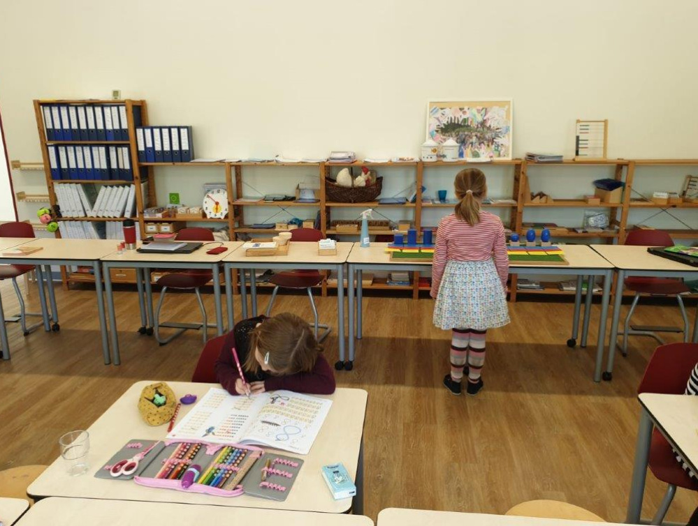 Auch in der aktuellen besonderen Unterrichtssituation müssen die Kinder, die zur Schule kommen dürfen, nicht auf die gewohnte Arbeit mit den Montessori-Materialien verzichten. Natürlich muss auch hierbei die Abstandsregel von 1,5 Metern eingehalten werden und nach der Arbeit wird das Material selbstverständlich desinfiziert, so dass das nächste Kind mit den Materialien weiterarbeiten kann.