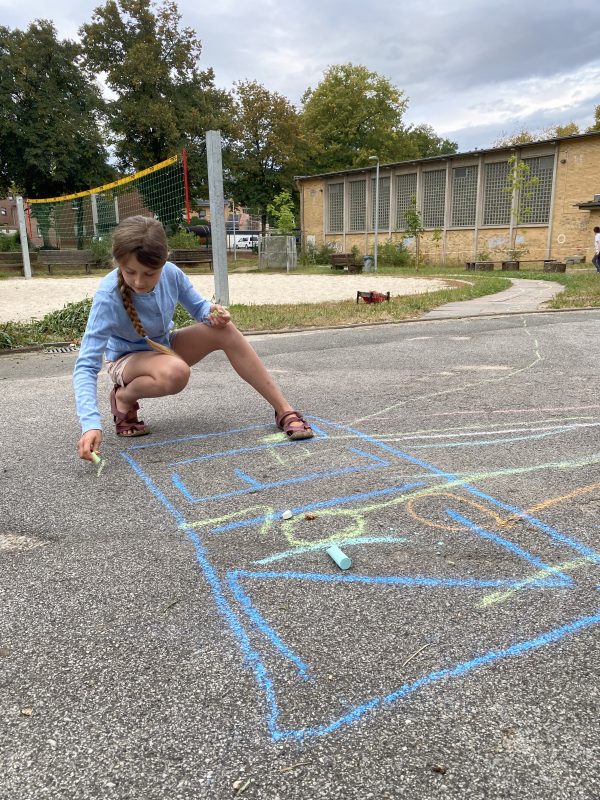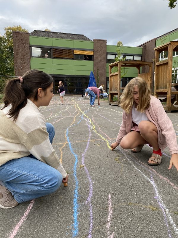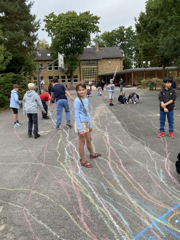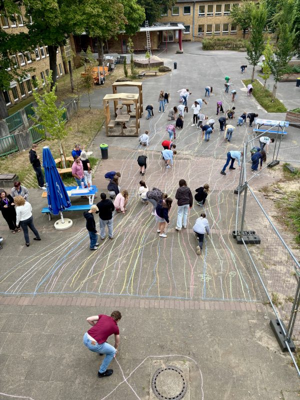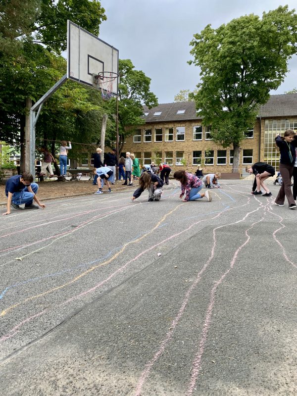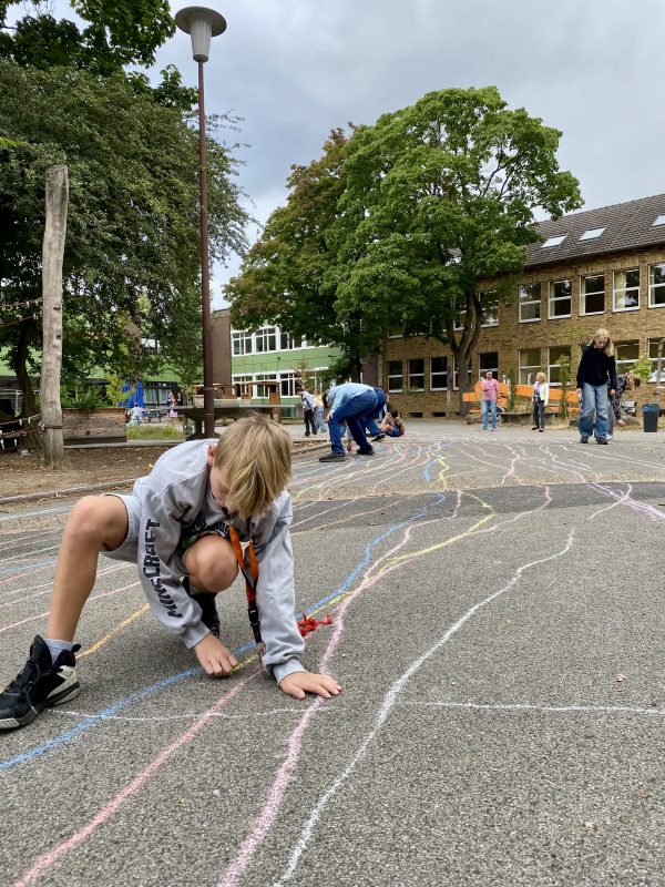 Unsere Schüler*innen der E-Stufe starten mit Straßenmalkreide in der Hand an unterschiedlichen Startpunkten und machen eine spannende Entdeckung: